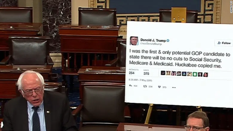 Vermont Sen. Bernie Sanders brought a giant printout of one of Donald Trump’s tweets, in which the President-elect promised not to cut Social Security, to the Senate floor. [van id=”politi...