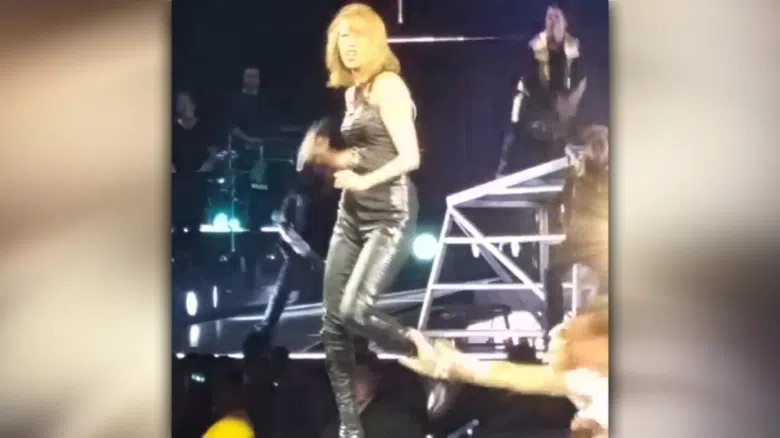 Taylor Swift looks shocked as a fan reaches for her ankle during her concert in Edmonton, Canada.